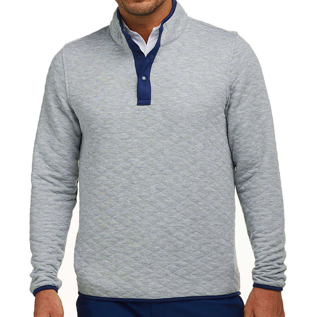 Corporate layering gets a refined upgrade with the Holderness & Bourne Men's Heathered Grey & Navy The Sullivan Pullover in heathered navy. This pullover is made from performance fleece and delivers lightweight warmth, stretch, and structure without bulk. The sleek design transitions easily from the course to casual Friday, making it a staple for cool-weather comfort and effortless professionalism.